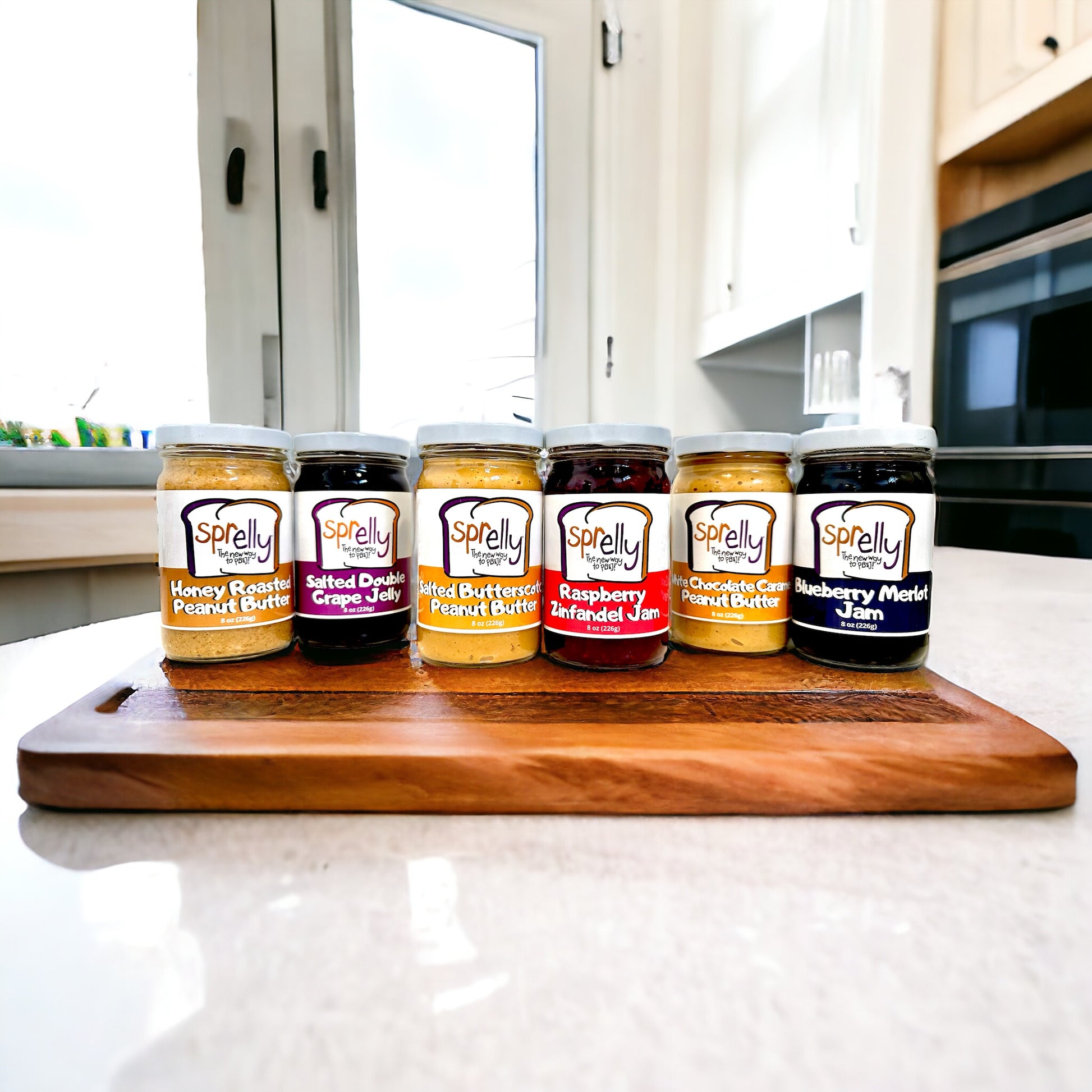 Our other best selling PB&J pairings, bundled together! This pack has Honey Roasted Peanut Butter, Salted Double Grape Jelly, Salted Butterscotch Peanut Butter, Raspberry Zinfandel Jam, White Chocolate Caramel Peanut Butter, and Blueberry Merlot Jam. Everything is delicious!