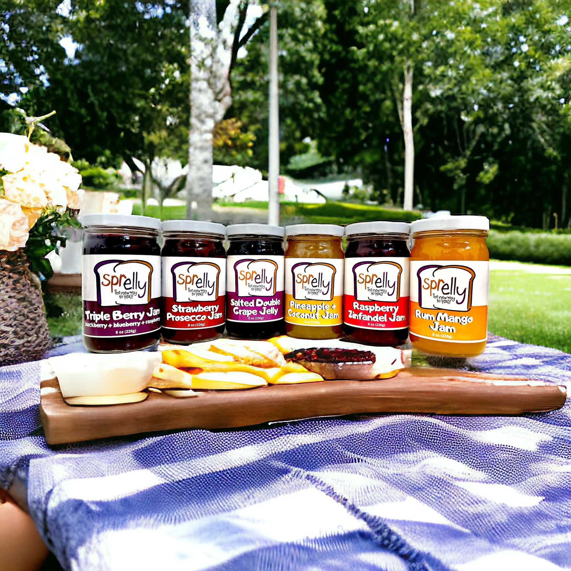Make everyone else jelly with this Sprelly six pack! A fruity paradise awaits! Includes: Triple Berry Jam, Strawberry Prosecco Jam, Salted Double Grape Jelly, Pineapple/Coconut Jam, Raspberry Zinfandel Jam, and Rum Mango Jam