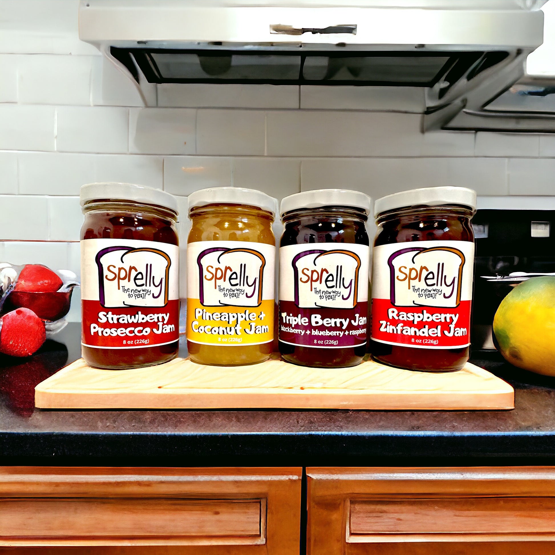 These jams are exquisite! Strawberry Prosecco Jam, Pineapple Coconut Jam, Triple Berry Jam, and Raspberry Zinfandel Jam will all make your friends jelly that they don't have Sprelly.