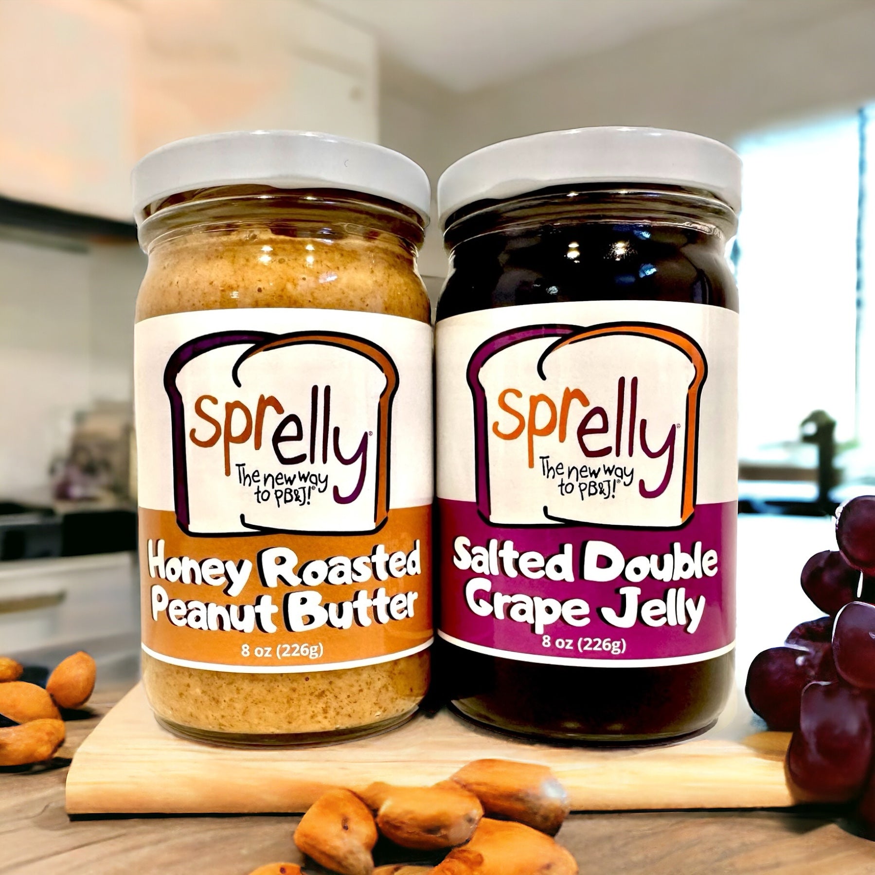 This Sprelly combo is like the classic PB+J combo you remember as a kid!The Honey Roasted Peanut Butter is a classic spread with the added awesomeness of being roasted in honey + sugar. It’s perfectly paired with The Salted Double Grape Jelly that carries more of that amazing grape flavor with less of the sweet.For sure a classic turned up a notch!