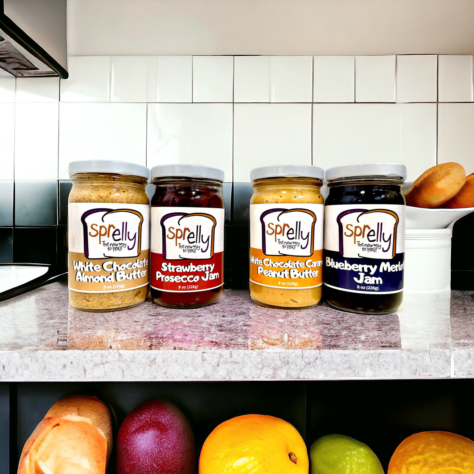 What a delectable group! White Chocolate Almond Butter, Strawberry Prosecco Jam, White Chocolate Caramel Peanut Butter, and Blueberry Merlot Jam.