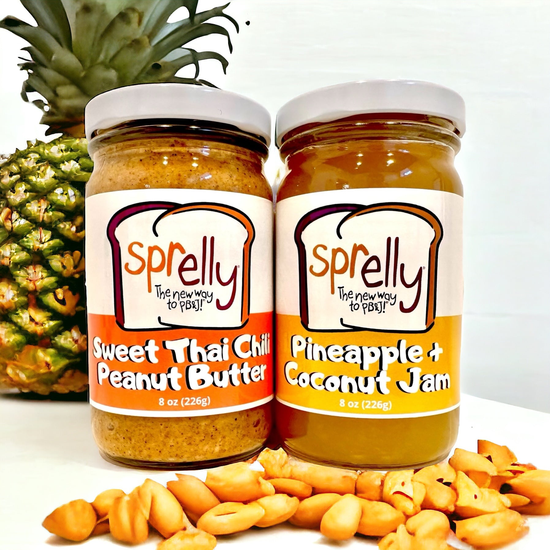 These two Sprelly flavors will take you on an elevated PB+J flavor journey that you never knew you needed! The Sweet Thai Chili Peanut Butter starts with an earthy peanut flavor and then rounds out with a perfect amount of heat. Then you’re journey cools off as you feel like are swept away to someplace tropical with The Pineapple + Coconut Jam!This amazing combo is another one that makes Sprelly the New Way to PB+J!
