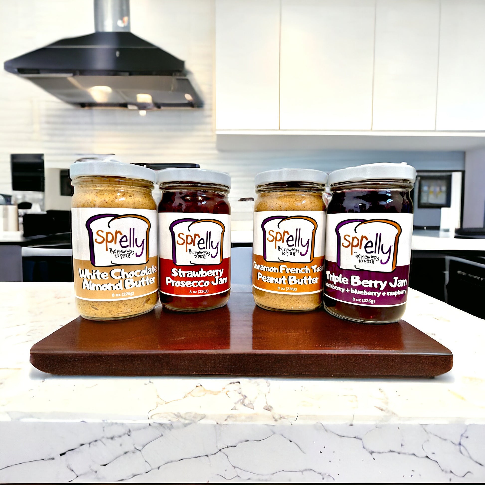 Our most popular PB&J sets! White Chocolate Almond Butter with the Strawberry Prosecco Jam and the Cinnamon French Toast Peanut Butter with the Triple Berry Jam.